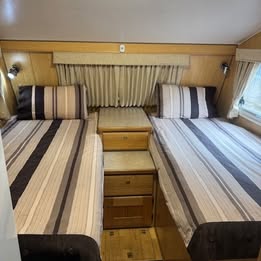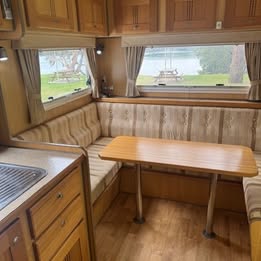 Interior fit out is in Neo Oak Panelling with striped cream fabric. Bedding is 2 x extended (2m) single beds with additional double bed on drop down table in saloon area. The large club lounge saloon area is at back of van with fantastic large windows all around so you can enjoy the view at your favourite campsite even in rainy weather! Also to note the ceiling height has also been increased by 50mm from standard.