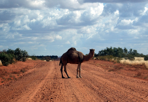A few months ago a man was badly injured when his vehicle ran into a herd of camels on the Lasseter. After that incident, police warned grey nomads again of the very real danger of hitting wandering stock or large animals, especially at night. There are an average 2.17 camel-related crashes annually in the Northern Territory alone … many of them serious. Camels also create another major hazard for vehicles by taking dust baths on the road, piling heaps of soft sand on an otherwise smooth surface.