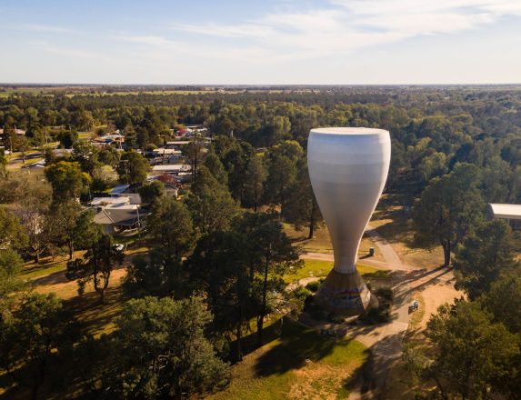 However, it is the distinctive wine glass-shaped water tower which first catches the eye. The 80,000-tile mosaic which decorates the structure depicts the story of Coleambally.
