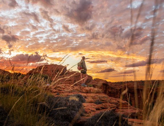 While the road north starts here, most people are not in a hurry to leave Watarrka National Park, the home of the 270-metre deep Kings Canyon. A moderately challenging six-kilometre walk takes in magnificent views of the Canyon rim, the weathered, buttressed domes of ‘The Lost City’ and the ‘Garden of Eden’ – a sheltered valley with permanent waterholes.