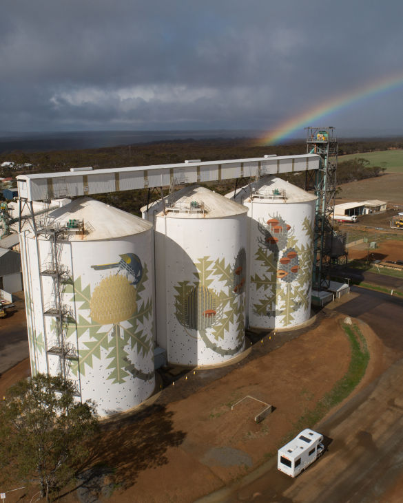 The best place to learn about how the town developed is at the Ravensthorpe Historical Society Museum, but this community is not just relying on its proud past to draw grey nomads to town. Its three recently painted silos now pay colourful tribute to the wildflowers for which the area is famous, and depict the different flowering cycle stages of the Banksia baxteri species.